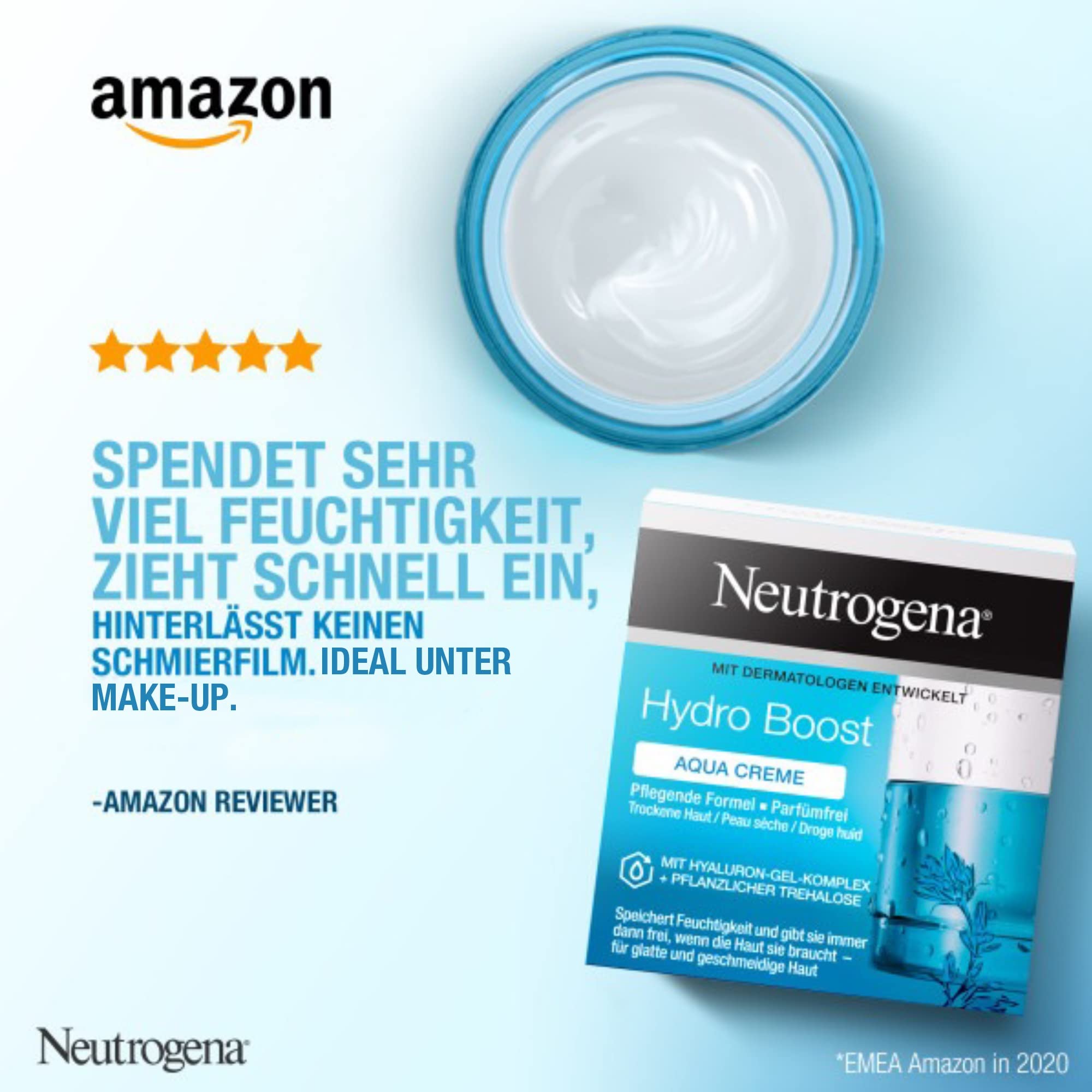 • Lieferumfang – 1 x 50 ml Neutrogena Hydro Boost Aqua Creme, mit Dermatologen entwickelte & parfümfreie Tagescreme mit purer Hyaluronsäure für glatte & geschmeidige Haut, Testsieger Stiftung Warentest