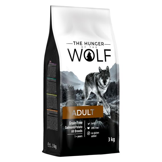 The Hunger of the Wolf Hundefutter für ausgewachsene Hunde aller Rassen und für Hunde mit Allergien, Fein zubereitetes Trockenfutter ohne Getreide mit Lachs und Kartoffeln - 3 kg
