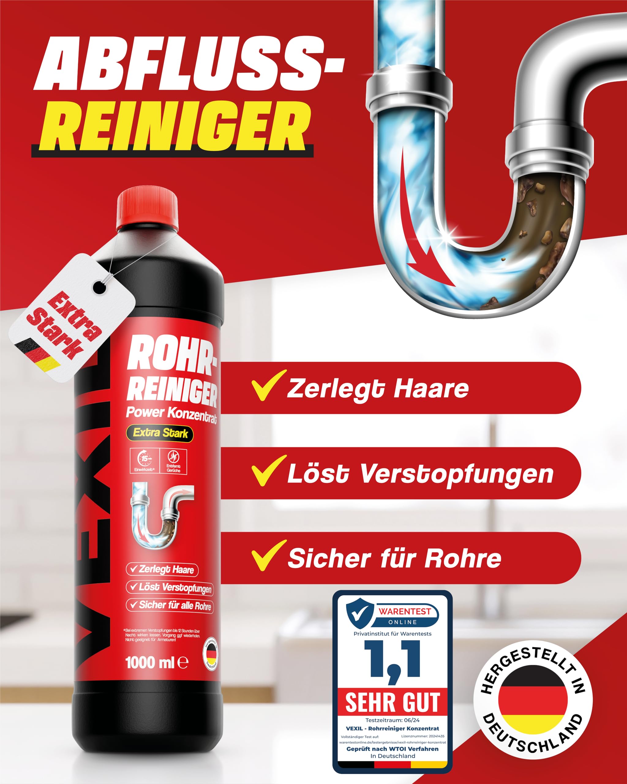 VEXIL Rohrreiniger - Profi Abflussreiniger EXTRA STARK für Extremfälle - Power Konzentrat löst hartnäckigste Verstopfungen wie Haare, Seifenreste, Fette - biologisch abbaubar - Made in Germany