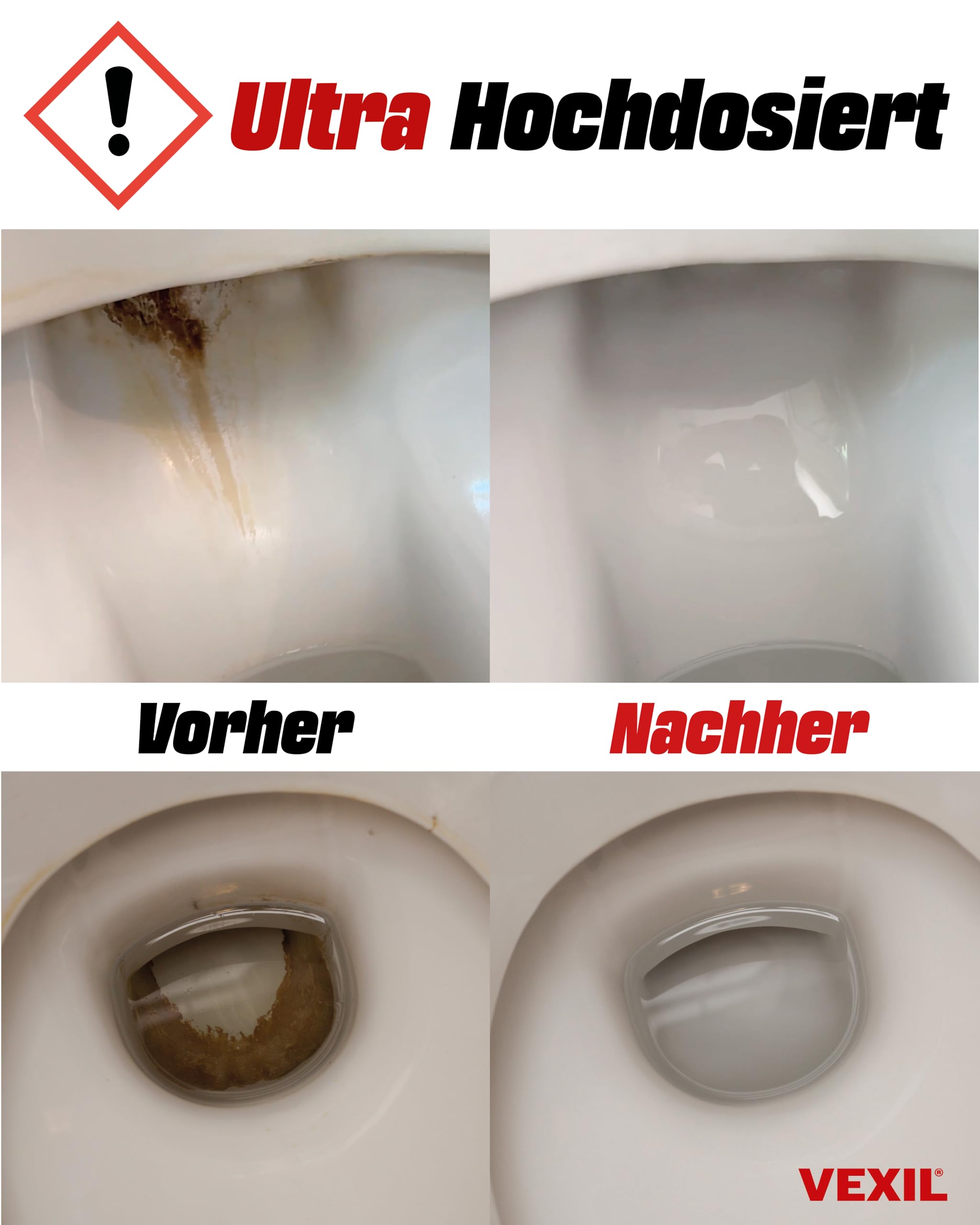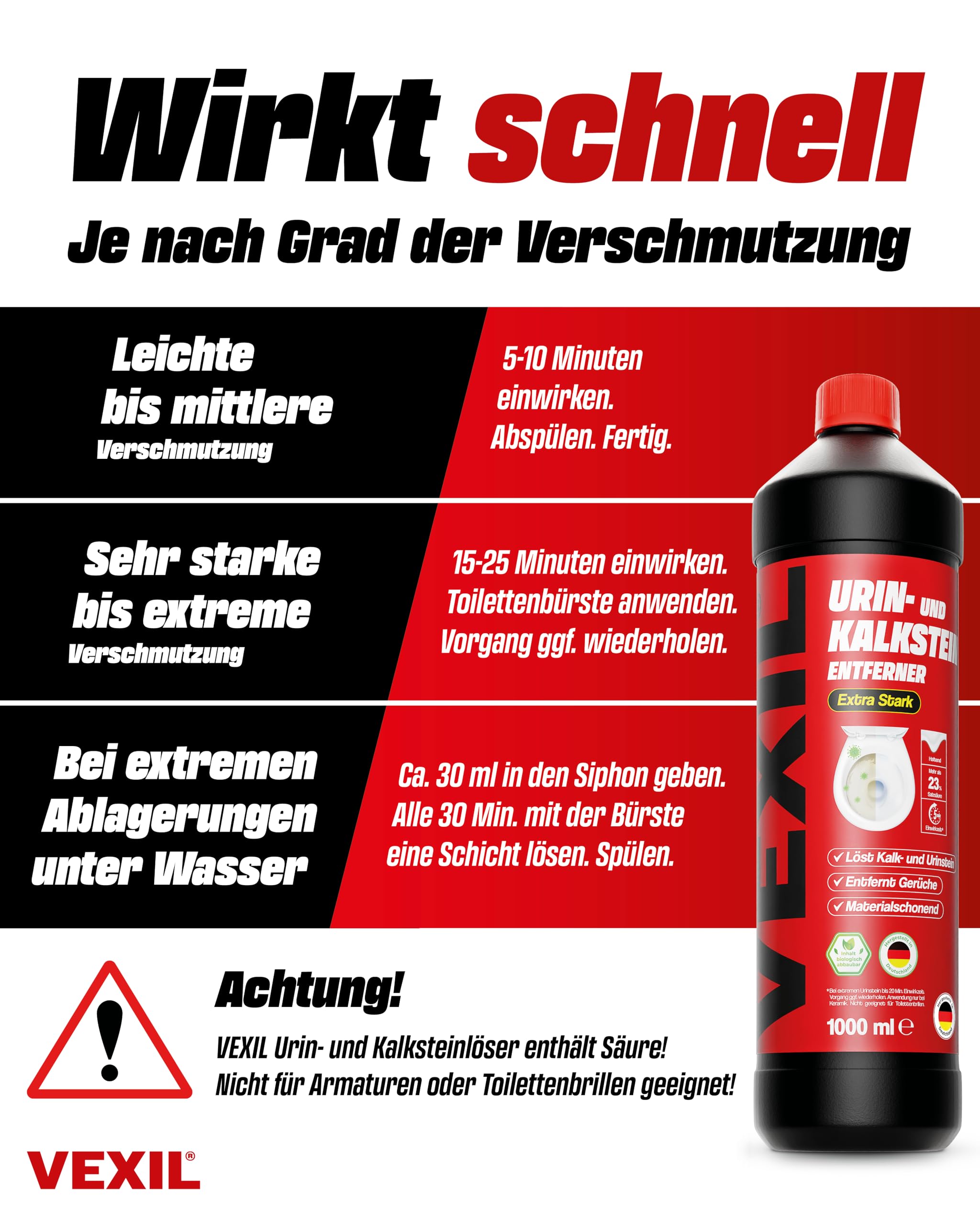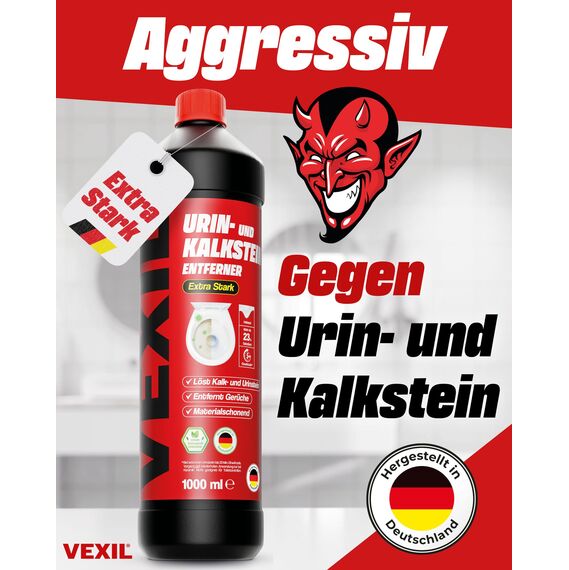 • AGGRESSIV GEGEN URIN- & KALKSTEIN – Achtung, nichts für schwache Nerven! Durch die hoch dosierte Salzsäure zersetzt der VEXIL Urinsteinlöser mühelos hartnäckigen Urin- & Kalkstein. Der hoch konzentrierte Reiniger beseitigt effektiv Ablagerungen und unangenehme Gerüche.