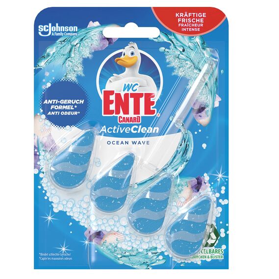 WC-Ente Active Clean ist ein WC-Spüler, der schäumt und die Toilette so kraftvoll reinigt. Der Toiletten-Reiniger in seiner Tropfenform bildet 4x mehr Schaum (im Vergleich zu WC-Ente Aqua Blue nach dem Spülvorgang) und sorgt für eine angenehme Citrus-Frische im gesamten Bad - für alle WCs mit Rand. Vergewissern Sie sich, dass die Toilette sauber ist bevor Sie den WC-Stein einhängen. Den WC-Einhänger ausklappen und am Rand der Toilette anbringen. Das Produkt so ausrichten, dass es während des Spülvorgangs im Wasserfluss liegt. Produkt entfernen und entsorgen, sobald es vollkommen aufgebraucht ist. Wenn möglich dem Recycling zuführen.