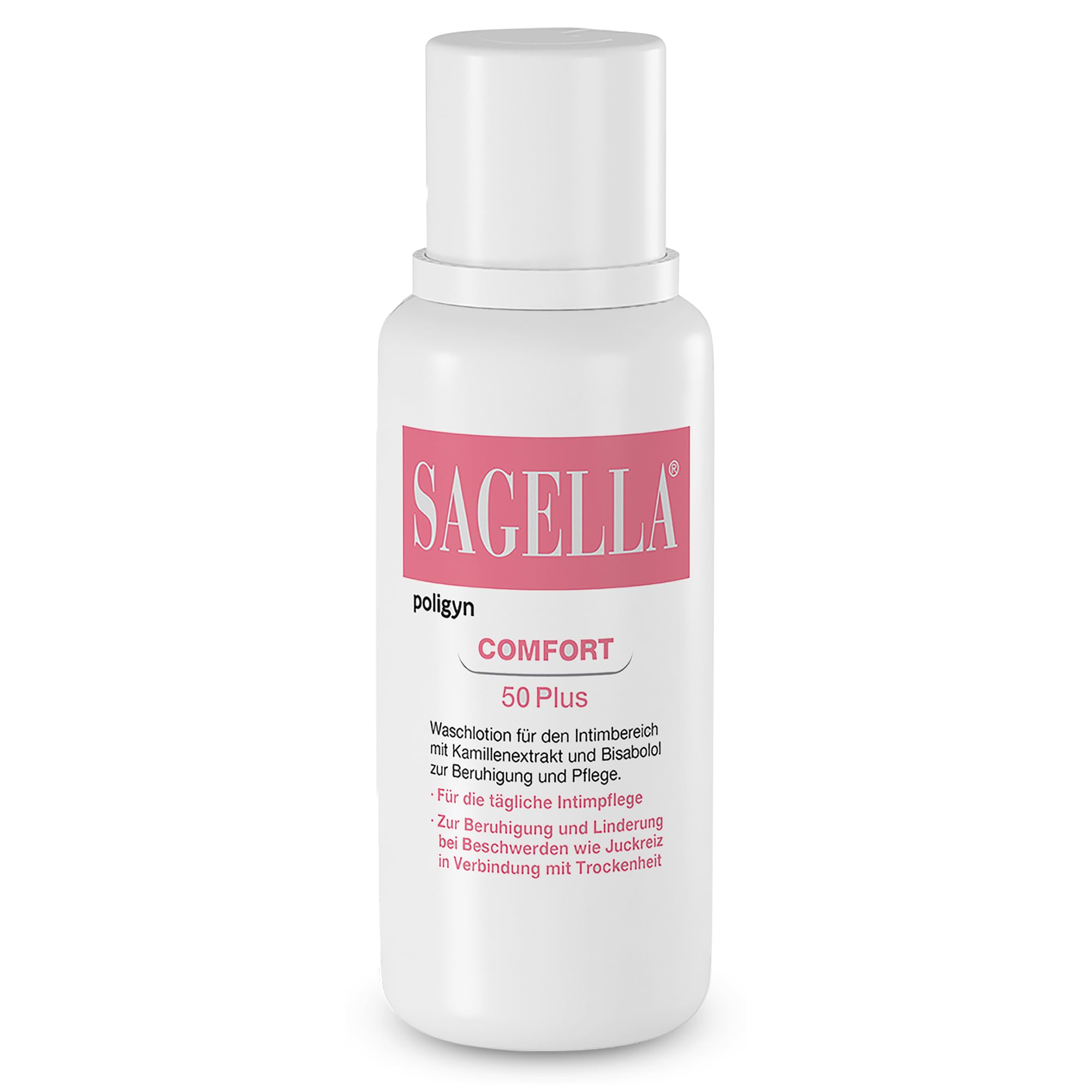 SAGELLA poligyn - COMFORT 50 Plus Intimwaschlotion. Die SAGELLA poligyn – COMFORT 50 Plus bietet umfangreiche Pflege für den Intimbereich von Frauen ab Beginn der Wechseljahre. Kamillenextrakt und Bisabolol entfalten eine beruhigende und wundheilungsfördernde Wirkung und hinterlassen bei der Intimpflege ein angenehm frisches Gefühl. Beschwerden wie Brennen oder Juckreiz in Verbindung mit Trockenheit werden dadurch schonend gelindert. Die Formel von SAGELLA poligyn – COMFORT 50 Plus ist genau auf die veränderten Bedürfnisse der Frau ab Beginn der Menopause angepasst. Mit einem pH-Wert von 6 bis 7 sorgt die Waschlotion für Schutz und Balance der vaginalen Flora. Die Intimwaschlotion ist seifenfrei und kann wie ein Duschgel unter der Dusche, in der Badewanne oder dem Bidet für die tägliche Intimpflege verwendet werden. Im Überblick: Waschlotion für die tägliche Intimpflege, mit Kamillenextrakt und Bisabolol, entzündungshemmend, antibakteriell & heilungsfördernd, Für Frauen in und nach den Wechseljahren, pH-Wert angepasste Intimpflege, Gynäkologisch und dermatologisch getestet