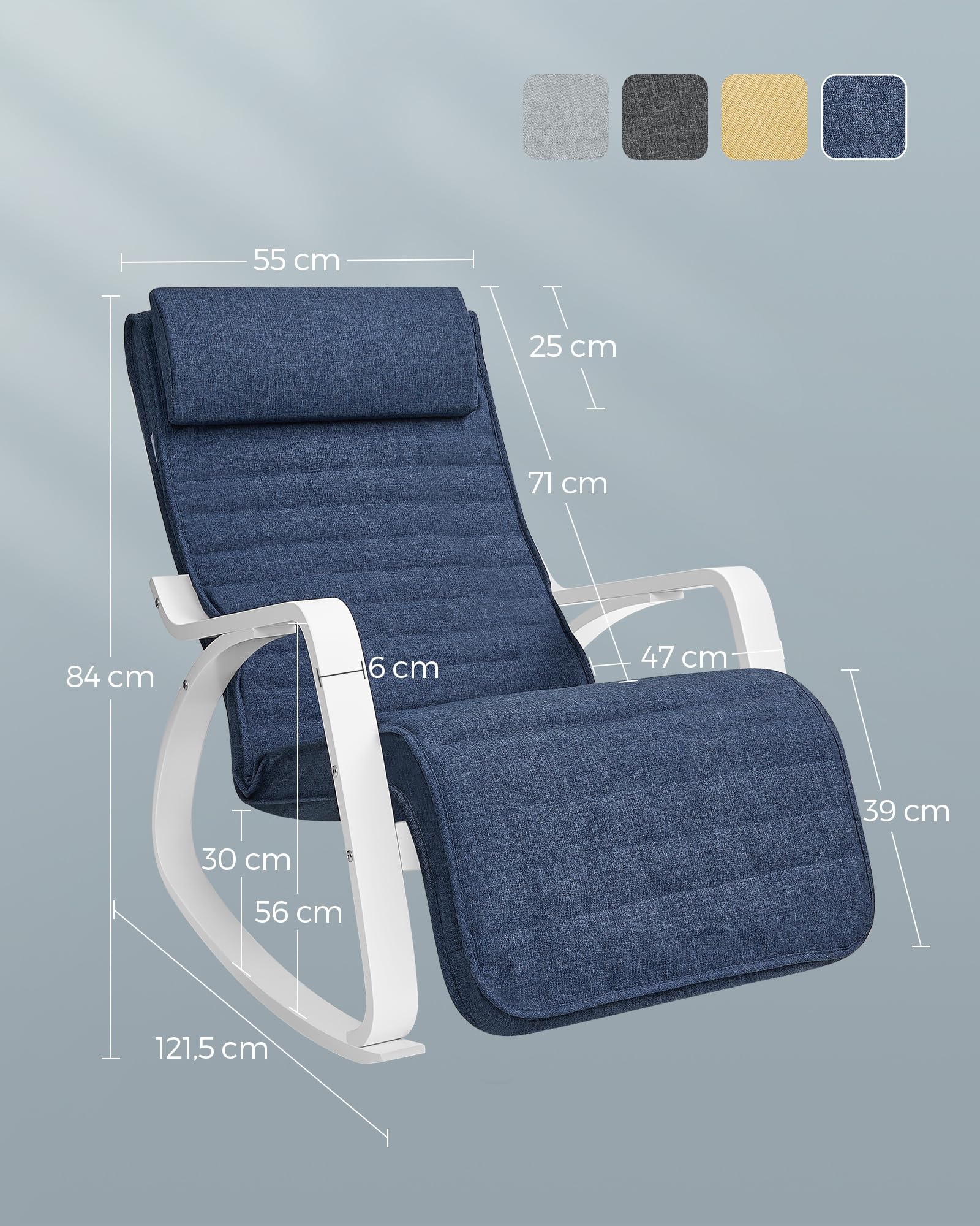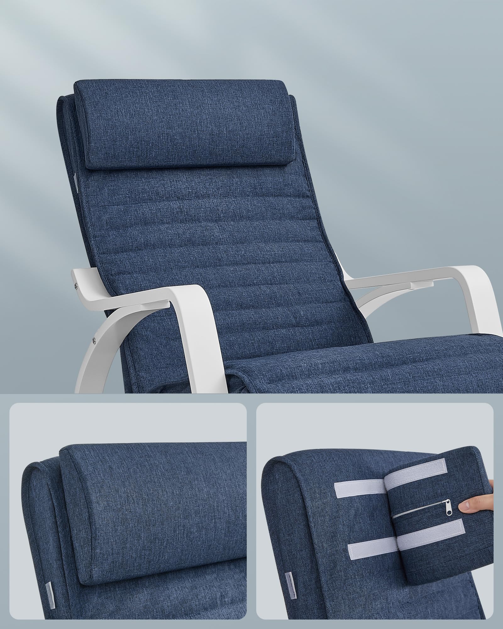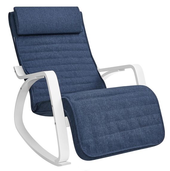 SONGMICS Schaukelstuhl, mit Armlehnen aus Birkenholz, Schaukelsessel, 5-Fach verstellbare Fußstütze, bis 150 kg belastbar, für Schlafzimmer, Wohnzimmer, mitternachtsblau-weiß LYY011Q01