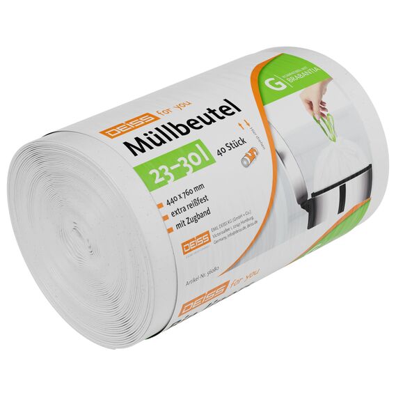 DEISS for you Müllbeutel 30 Liter – Effizienz und Nachhaltigkeit für professionelle AnwendungenDie DEISS for you Müllbeutel mit einem Volumen von 30 Litern und den Maßen 440 x 760 mm sind die ideale Lösung für eine effiziente und umweltfreundliche Abfallentsorgung in verschiedenen Bereichen.Material: HDPE (Polyethylen hoher Dichte)Stärke: 24 µmFarbe: WeißVerpackungseinheit: 40 Stück pro Rolle, 400 Stück pro KartonBesonderheit: Integriertes grünes Zugband für einfaches VerschließenVorteile auf einen Blick:Hohe Reiß- und Durchstoßfestigkeit für sichere EntsorgungRecyclingfähig und umweltfreundlichVielseitig einsetzbar in verschiedenen BranchenPraktisches Zugband für hygienisches ArbeitenSetzen Sie auf DEISS for you Müllbeutel für eine zuverlässige und nachhaltige Abfallentsorgung in Ihrem Betrieb.:contentReference[oaicite:12]{index=12}