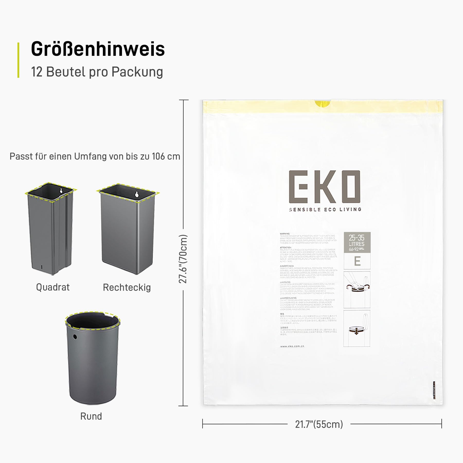 EKO Müllbeutel 25–35L, Reißfeste Müllsäcke mit praktischem Zugband, Größe E, Extra starke & dichte Mülltüten für Küchenmülleimer, 12 Stück, Weiß