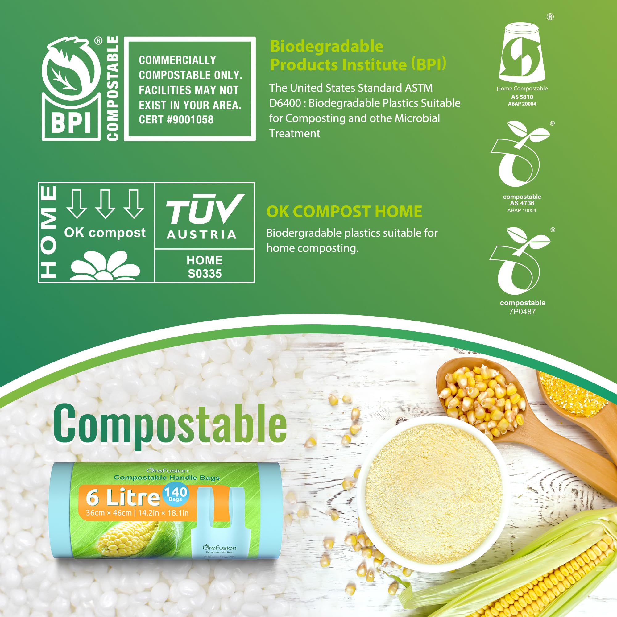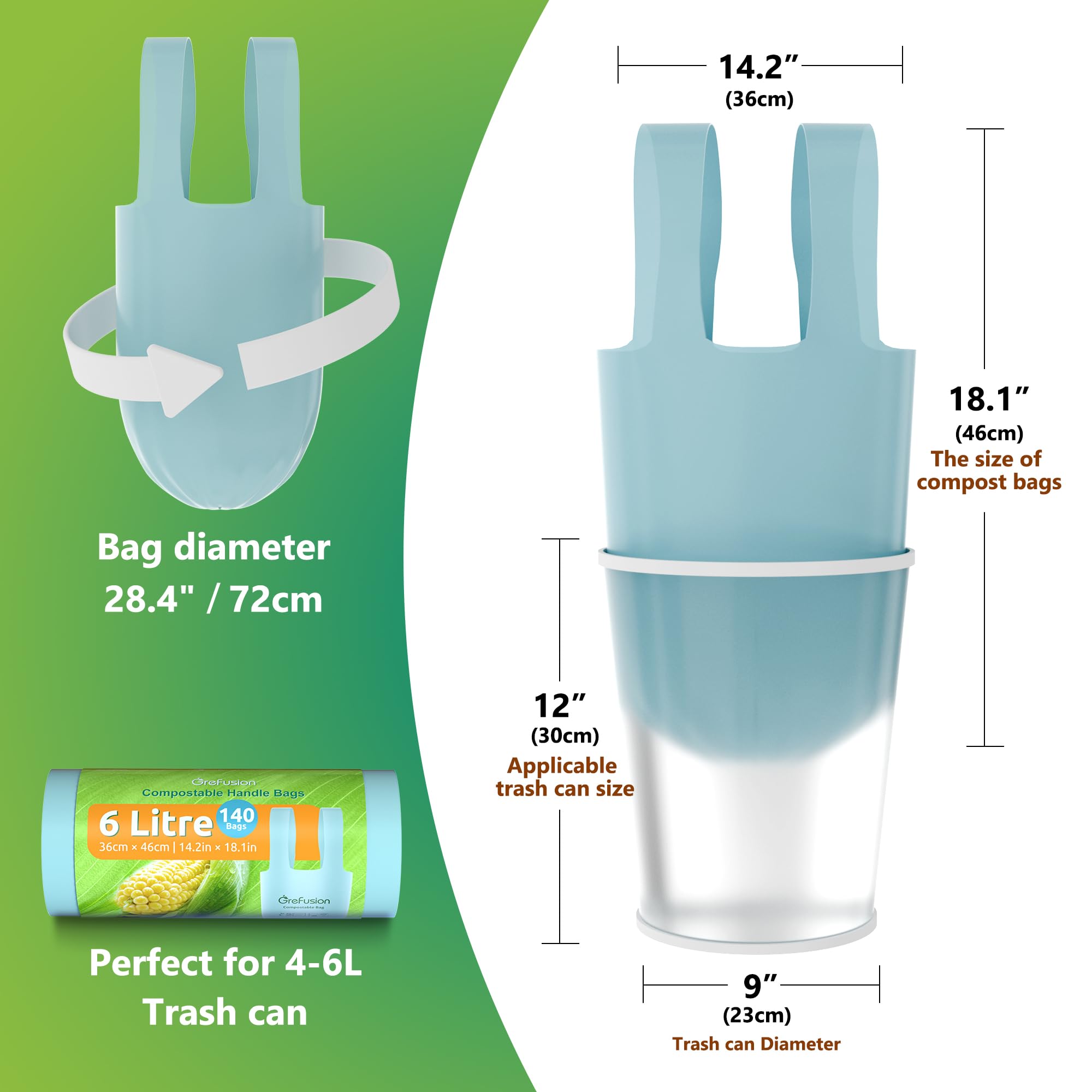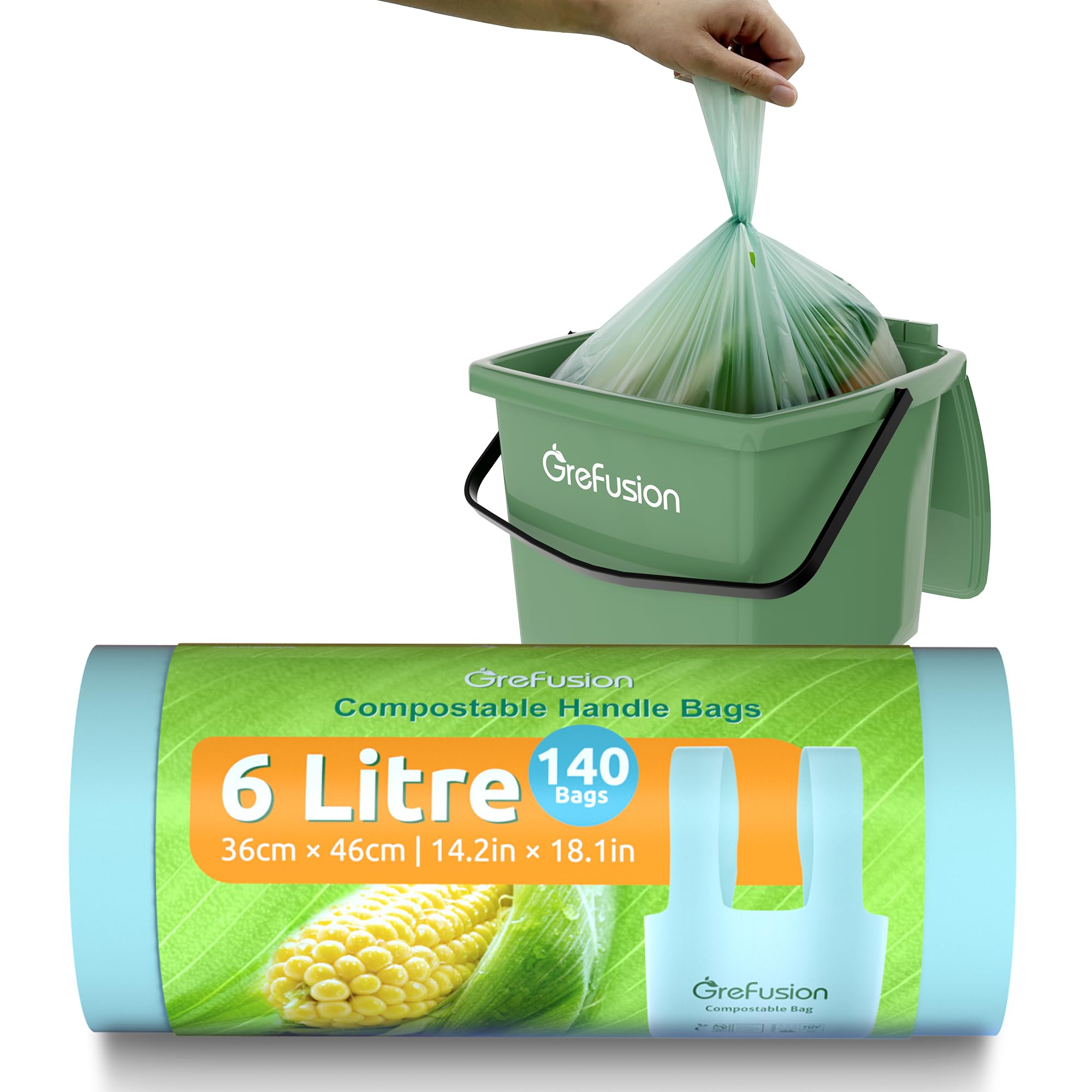 GreFusion Lebensmittelabfallbeutel, 6 l, extra dick, kompostierbar, 6 l, mit Griffen, 140 Stück