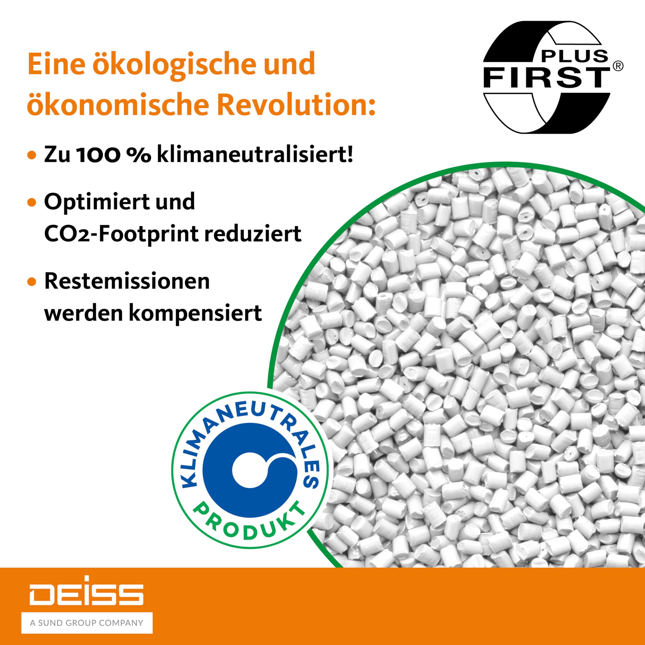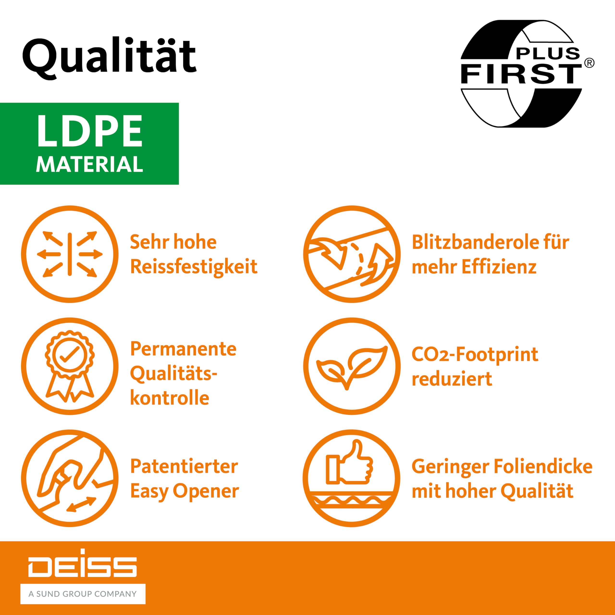 Die FIRST PLUS PE-LD-Folie ist dickenreduziert. Sie überzeugt dennoch durch einen hohen Dart-Drop-Wert, der ihre sehr gute Durchstoßfestigkeit bestätigt. In der Anwendung hat sie die gleichen technischen Vorteile wie eine herkömmliche PE-LD Folie. Dies sorgt für vielfältige und leichte Handhabung. Der mit der Dickenreduzierung verbundene niedrigere Rohstoffbedarf, das geringere Rollengewicht, die Senkung der Transportkosten und des CO2-Ausstoßes sorgen in vielfacher Hinsicht für eine nachhaltige Wirkung auf unsere Umwelt. FIRST PLUS Müllbeutel bieten außerdem mit ihren technischen Vorteilen, der besonders schnell zu öffnenden Banderole und dem patentierten Easy Opener, entscheidende Vorteile bei der Anwendung. Sie sind Ihr Innovations-PLUS für Sicherheit und Effizienz im täglichen Einsatz.