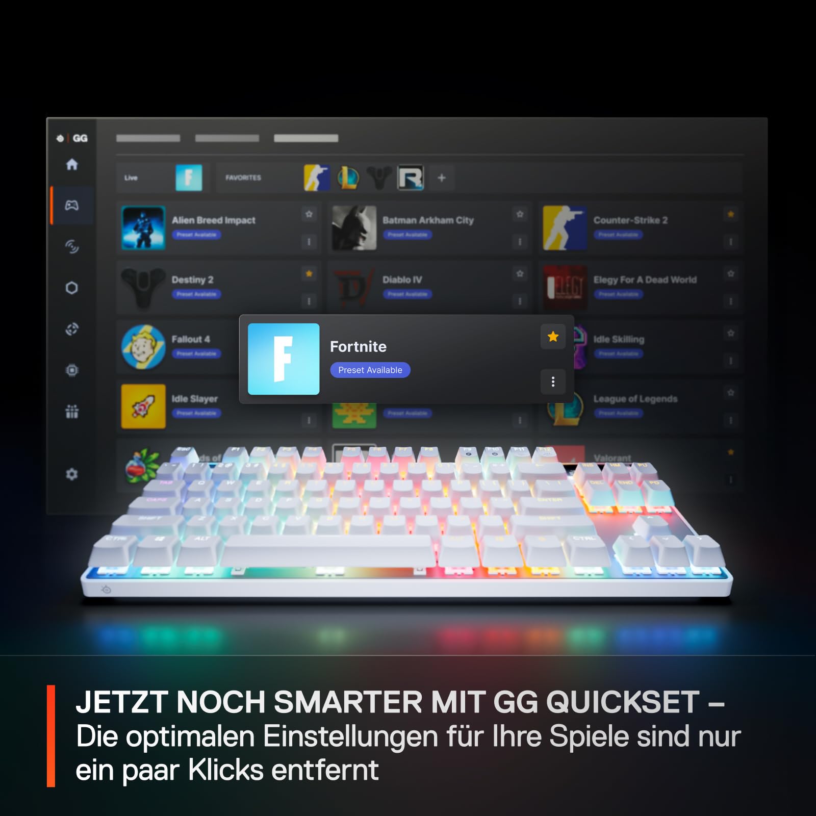 • SOFORT EINSATZBEREITE PRESETS - Verschaffen Sie sich mit nur wenigen Klicks einen Wettbewerbsvorteil in Ihrem Lieblingsspiel, indem Sie die sofort einsatzbereiten Tastatureinstellungen von GG Quick Set verwenden.