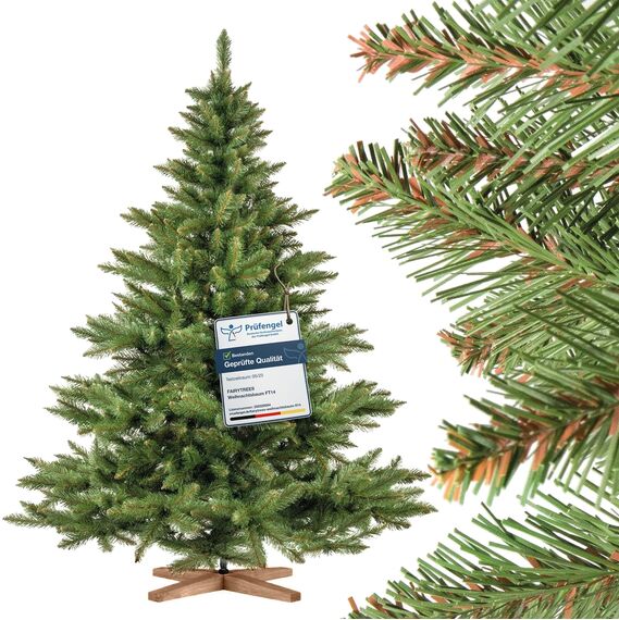 "Der künstliche Weihnachtsbaum FairyTrees FT14 ist inspiriert von der klassischen Form der Nordmanntanne und besticht durch sein elegantes, leicht tailliertes Design. Diese künstliche Nordmanntanne überzeugt durch ihre harmonischen Zweig-Etagen, die dem Baum eine natürliche Optik verleihen und ihn sehr realistisch wirken lassen. Der Weihnachtsbaum künstlich 180 cm ist nur eine von vier Größen, die FairyTrees FT14 anbietet – neben 120 cm, 150 cm und 220 cm. So lässt sich der Baum ideal an verschiedene Raumgrößen anpassen, ob als zentraler Blickfang in großen Wohnzimmern oder als charmante Dekoration in kleineren Räumen. Die Proportionen bleiben bei allen Varianten ausgewogen, und das dunkle Tannengrün unterstreicht den festlichen Charakter. Die starken Zweige sind so konstruiert, dass sie sowohl leichte als auch schwere Dekorationen sicher tragen. Dadurch eignet sich der künstliche Weihnachtsbaum für vielfältige Schmuckideen. Die gut strukturierten Zweig-Etagen ermöglichen ein einfaches und ästhetisches Anbringen der Ornamente. Der Tannenbaum FT14 ist zudem besonders einfach aufzubauen. Im Lieferumfang sind praktische Zubehörteile sowie Handschuhe und eine klare Anleitung enthalten, die das Dekorieren schnell und unkompliziert machen. Die Montage ist intuitiv und für jeden machbar. Für die Stabilität sorgt ein hochwertiger Ständer aus massivem Holz. Dieses natürliche Material stärkt nicht nur die Konstruktion, sondern verleiht dem Baum eine elegante Note, die perfekt mit dem dunklen Grün harmoniert. Die Nordmanntanne wirkt dadurch authentisch und stilvoll. Der Tannenbaum FT14 gehört seit Jahren zu den FairyTrees-Bestsellern. Seine klassische Form, stabilen Zweige und der einfache Aufbau machen ihn zur beliebten Wahl für alle, die einen langlebigen und stilvollen Weihnachtsbaum suchen. Dunkles Tannengrün, ausgewogene Proportionen und ein robuster Ständer machen dieses Modell zum Mittelpunkt festlicher Dekorationen – in Hunderten von Haushalten!"