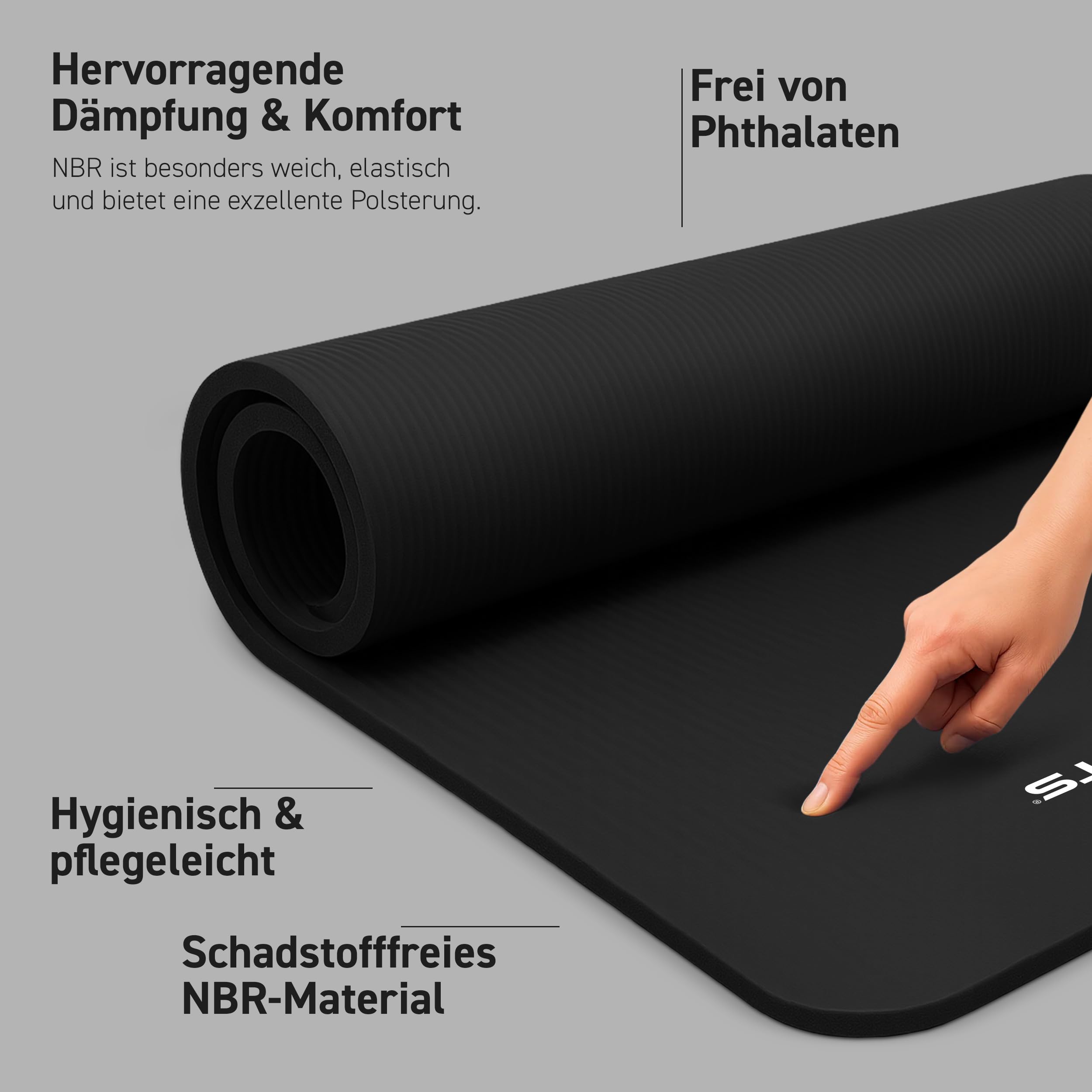 MSPORTS Gymnastikmatte Premium inkl. Tragegurt + Übungsposter + Workout App I Hautfreundliche Fitnessmatte 190 x 100 x 1,5 cm - Schwarz-Matt - Phthalatfreie Yogamatte