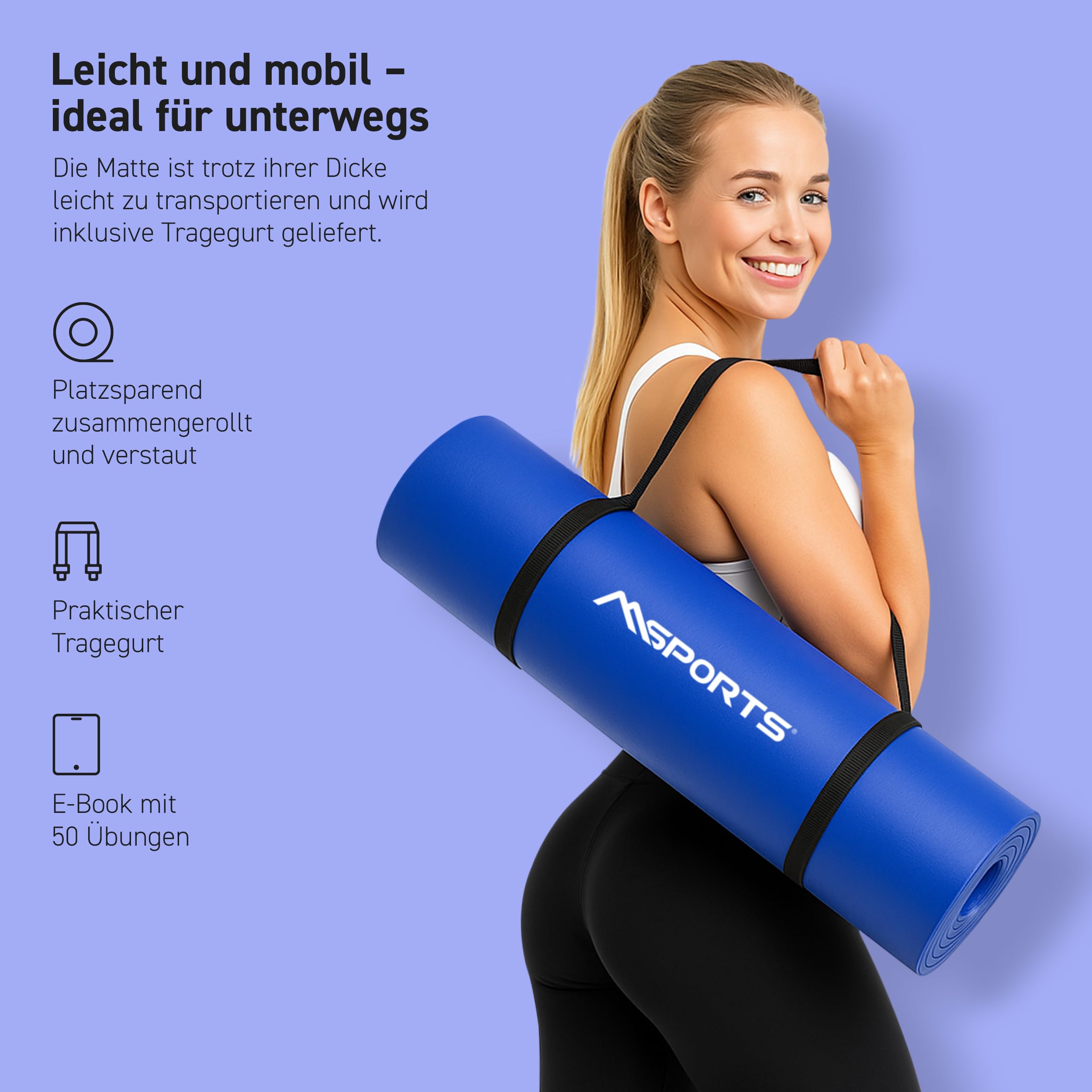 Die Fitnessmatte von Msports ist absolut VIELSEITIG. Geeignet für Indoor Aktivitäten wie: Yoga, Aerobic, rückenschonendes Bauchmuskeltraining, Pilates, Gymnastik, Turnen und Schwangerschaftsgymnastik. Aber auch im Outdoor Bereich einsatzbar z.B. beim CAMPING. Rollt man sie zusammen können auch PROPRIOZEPTIVE ÜBUNGEN durchgeführt werden.