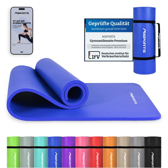 MSPORTS Gymnastikmatte Premium inkl. Tragegurt + Übungsposter + Workout App I Hautfreundliche Fitnessmatte 190 x 60 x 1,0 cm - Royalblau - Phthalatfreie Yogamatte