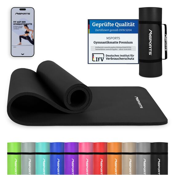 MSPORTS Gymnastikmatte Premium inkl. Tragegurt + Übungsposter + Workout App I Hautfreundliche Fitnessmatte 190 x 80 x 1,5 cm - Schwarz-Matt - Phthalatfreie Yogamatte