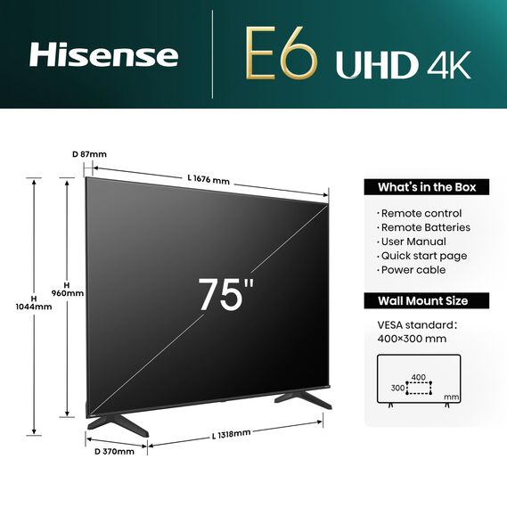 Hisense 75E6NT 189cm (75 Zoll) Fernseher, 4K UHD Smart TV, Precision Colour, HDR, Dolby Vision, 60Hz, Triple Tuner DVB-C/S/S2/T/T2, WiFi, HDMI 2.1, Bluetooth, Alexa Built-in, Schwarz, [2024]